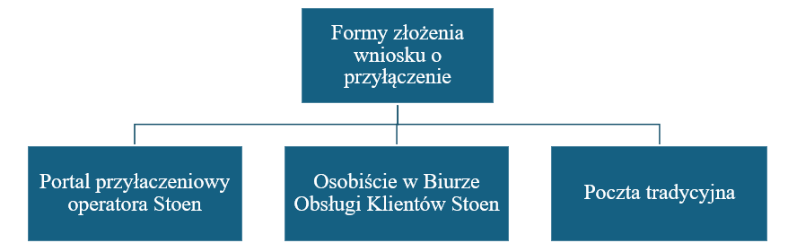 W pierwszej kolejności należy wypełnić wniosek o przyłączenie do sieci, które są do pobrania na stronie internetowej Stoen Operator, tj. https://www.stoen.pl/pl/strona/dokumenty. Wnioskodawca wypełnia jeden wniosek o określenie warunków przyłączenia do sieci elektroenergetycznej – w zależności od wielkości napięcia znamionowego linii, tj.[1]: