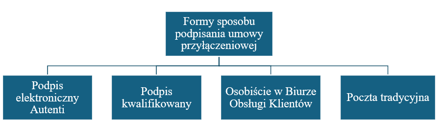 W propozycji umowy przyłączeniowej ujęty jest szczegółowy harmonogram realizacji pracy oraz wartość opłaty za przyłączenie do sieci energetycznych wyznaczonej na podstawie danych z tabeli 1. Dodatkowo w załącznikach do umowy przyłączeniowej określono zakres prac do realizacji. Propozycja umowy jest ważna na okres dwóch lat od dnia jej doręczenia do wnioskodawcy. Na rysunku 2 ujęto możliwości wyboru sposobu podpisania umowy przez klienta.