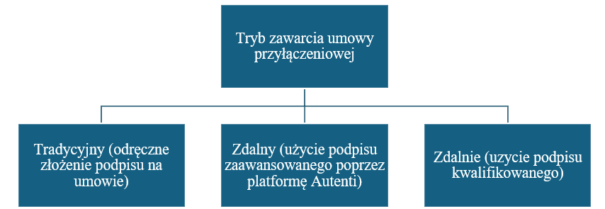 W świetle Kodeksu cywilnego obowiązuje zasada swobody zawierania umów, która stanowi jeden z szczególnie doniosłych reguł umożliwiający funkcjonowanie obrotu gospodarczego. Strony zawierające umowę o przyłączenie mogą ułożyć stosunek prawny według własnego uznania pod warunkiem, że cel bądź treść umowy nie był sprzeczny z właściwością (naturą) tegoż stosunku, jak również ustawie oraz zasadom współżycia społecznego[8]. W przypadku umowy przyłączeniowej ze Stoen Operator, to tryb zawarcia umowy może być trojakiego rodzaju (patrz rysunek 1).