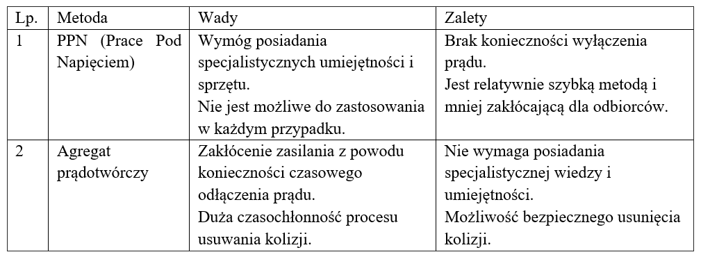 Zasadą usunięcia kolizji z siecią niskiego bądź średniego napięcia jest realizacja wyłącznie w celu zachowania jej dotychczasowej funkcji oraz w zgodności z aktualnie obowiązującymi przepisami prawnymi. Usuwanie kolizji na liniach elektroenergetycznych – w zależności od rodzaju i specyfiki kolizji oraz dostępnych narzędzi może być realizowane dwoma metodami, zaś każdy z nich posiada zarówno wady, jak i zalety – patrz tab. 1.